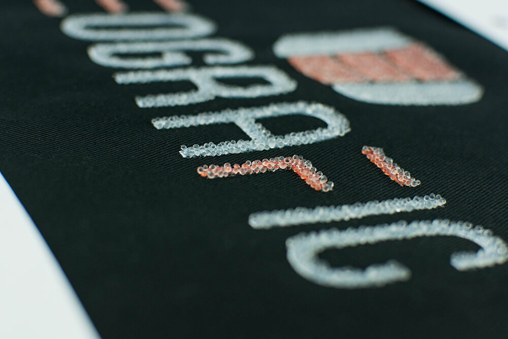 Una lavorazione che dona un effetto a rilievo e al tempo stesso vellutato grazie al trasferimento sull’area di stampa di piccolissime fibre di poliestere.