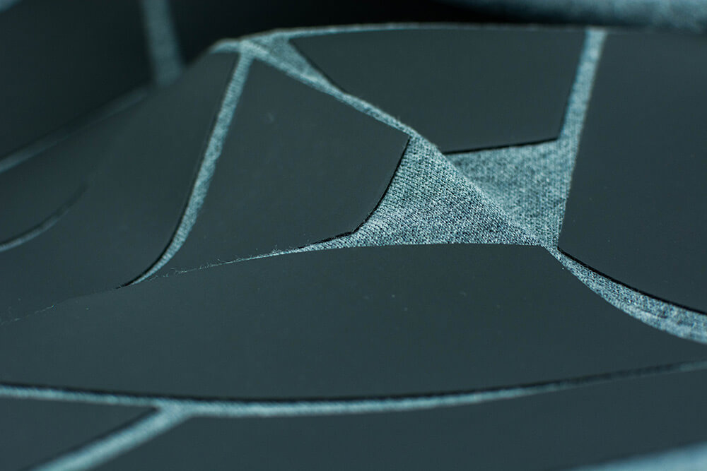 Consiste nel termosaldare un supporto in poliuretano stampato e sagomato, su un tessuto tramite calore.